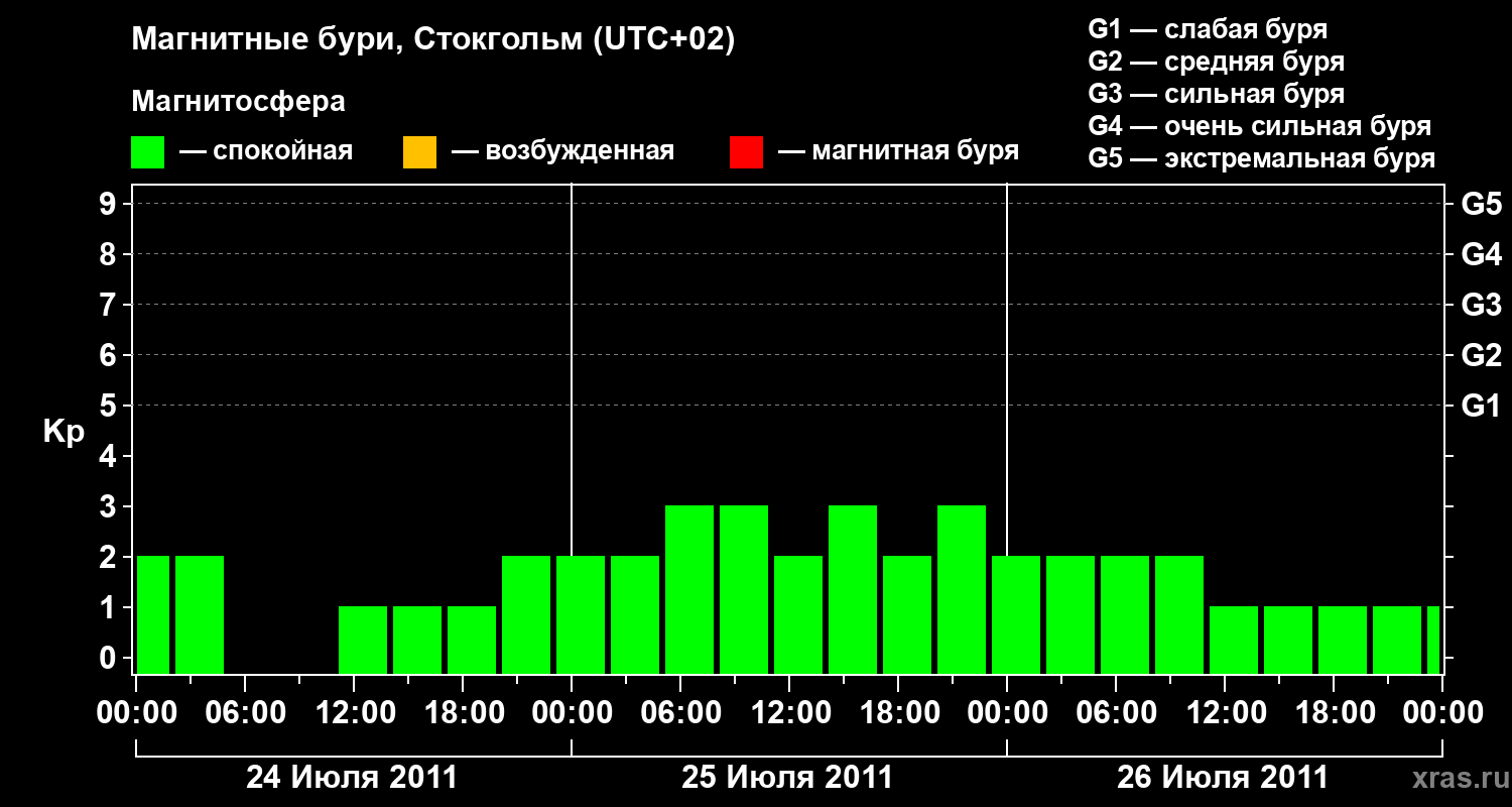 Изменения геомагнитного индекса Kp с 24 по 26 июля 2011 года для средних широт