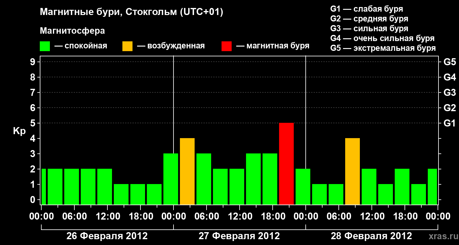 Изменения геомагнитного индекса Kp с 26 по 28 февраля 2012 года для средних широт