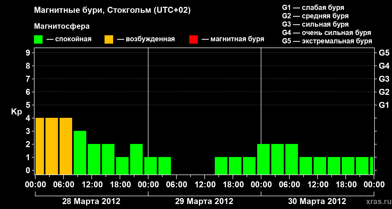 Изменения геомагнитного индекса Kp с 28 по 30 марта 2012 года для средних широт