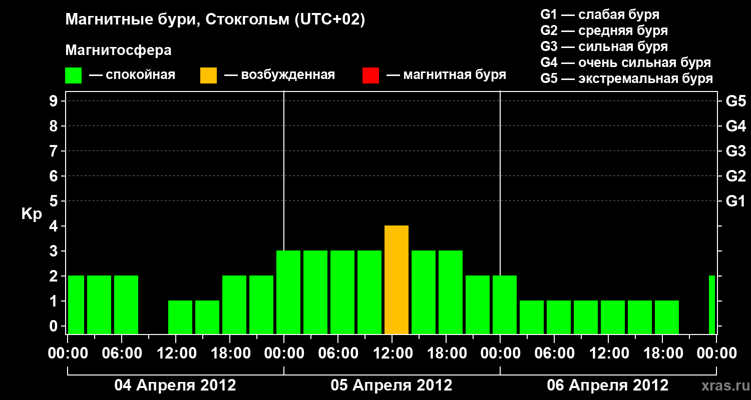 Изменения геомагнитного индекса Kp с 4 по 6 апреля 2012 года для средних широт