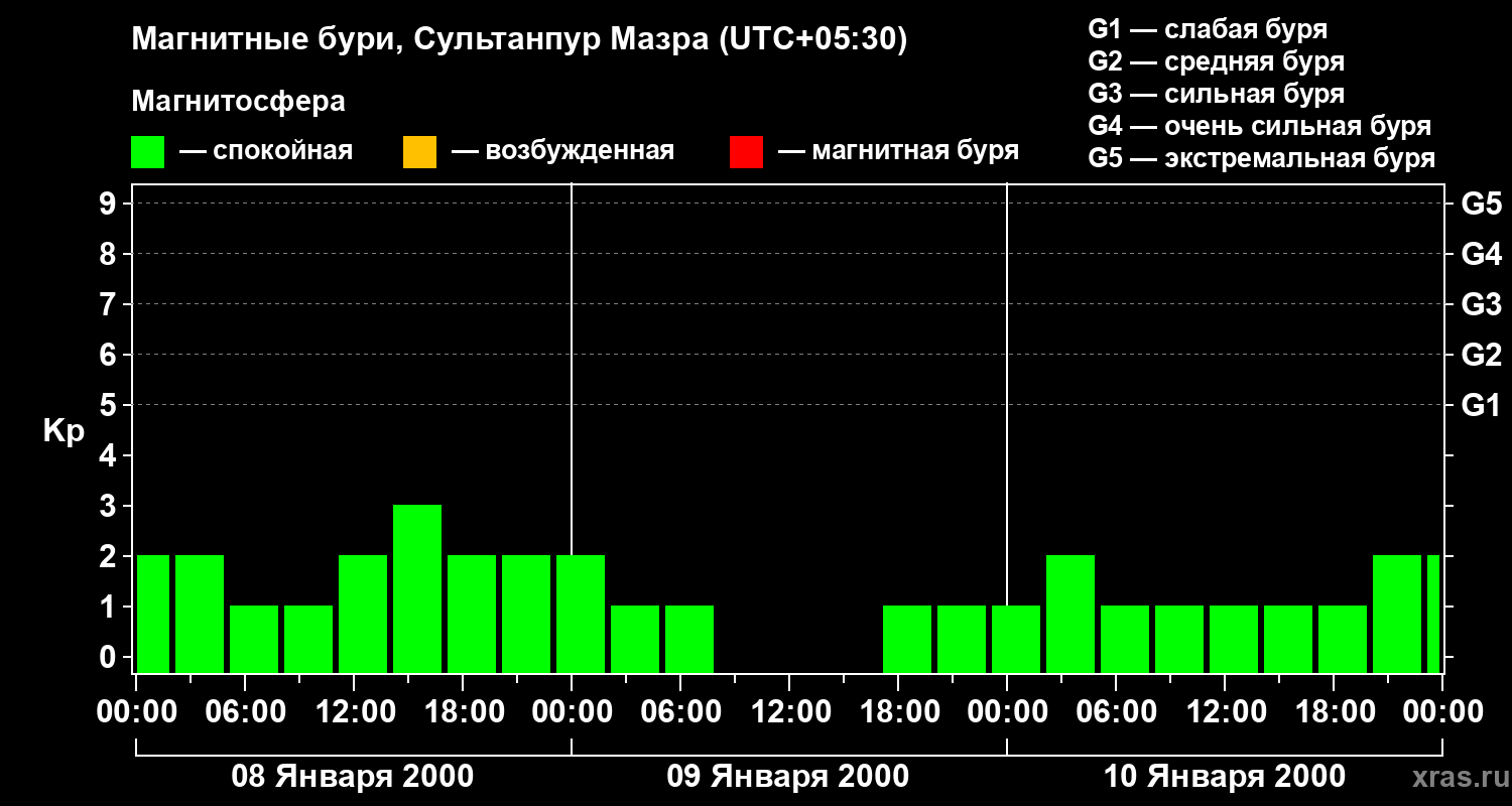 Изменения геомагнитного индекса Kp с 8 по 10 января 2000 года для средних широт