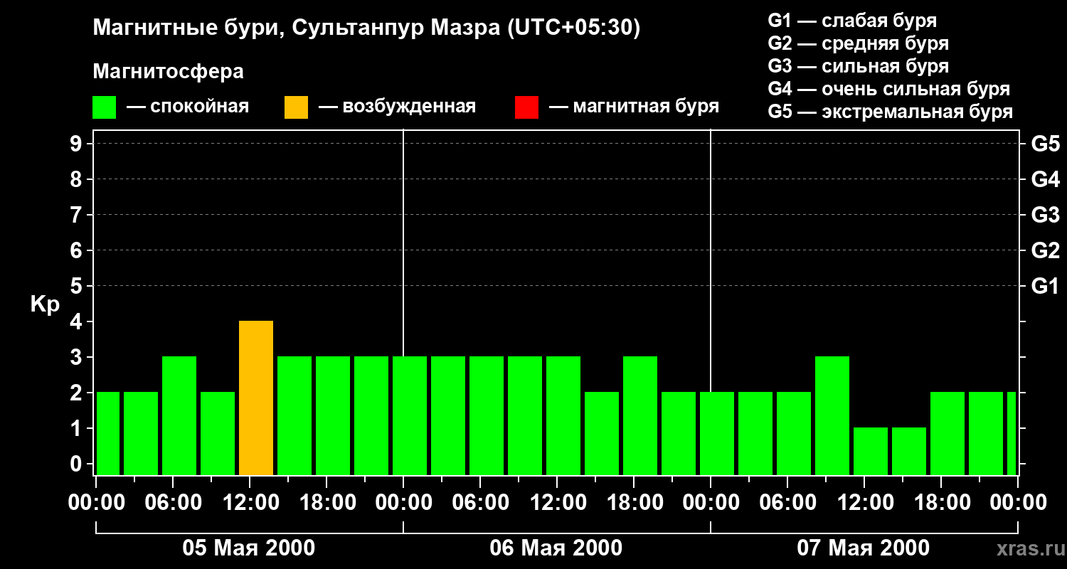 Изменения геомагнитного индекса Kp с 5 по 7 мая 2000 года для средних широт