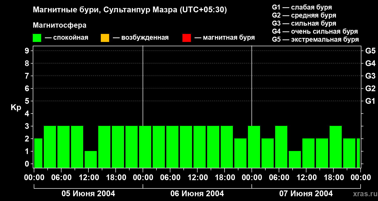 Изменения геомагнитного индекса Kp с 5 по 7 июня 2004 года для средних широт