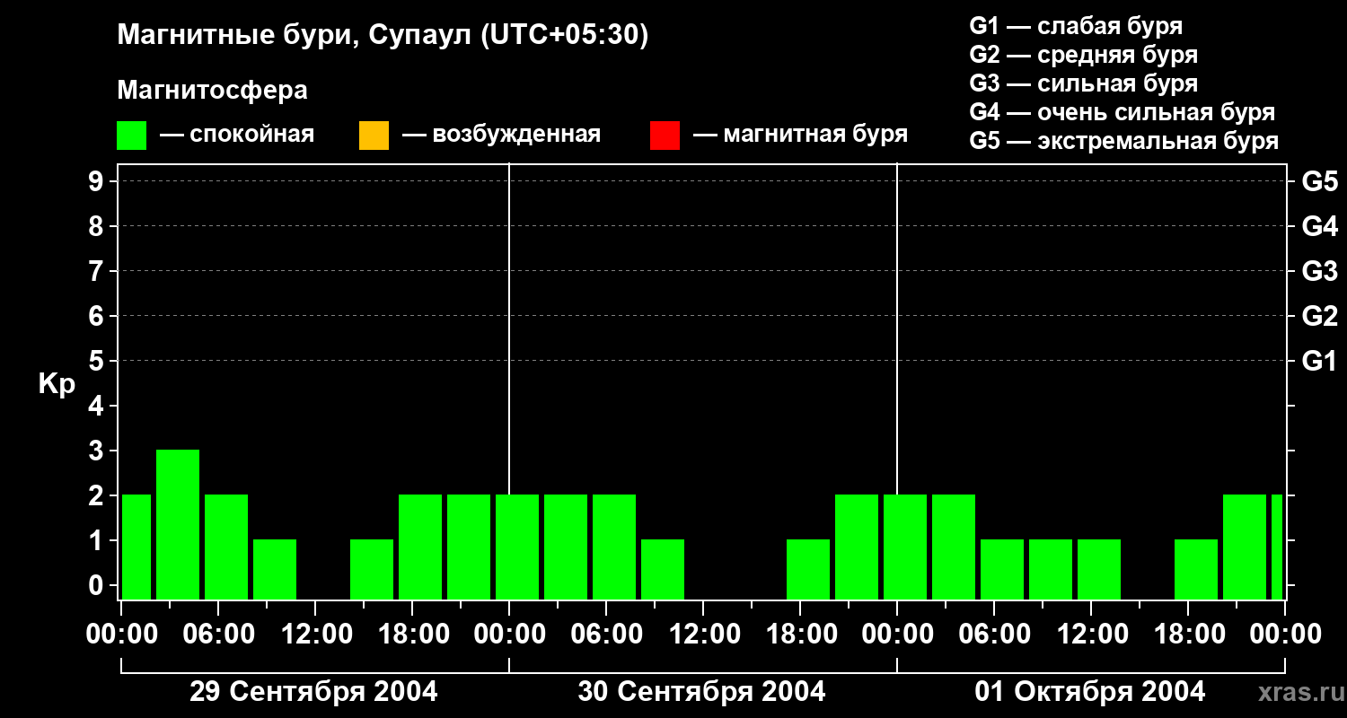 Изменения геомагнитного индекса Kp с 29 сентября по 1 октября 2004 года для средних широт