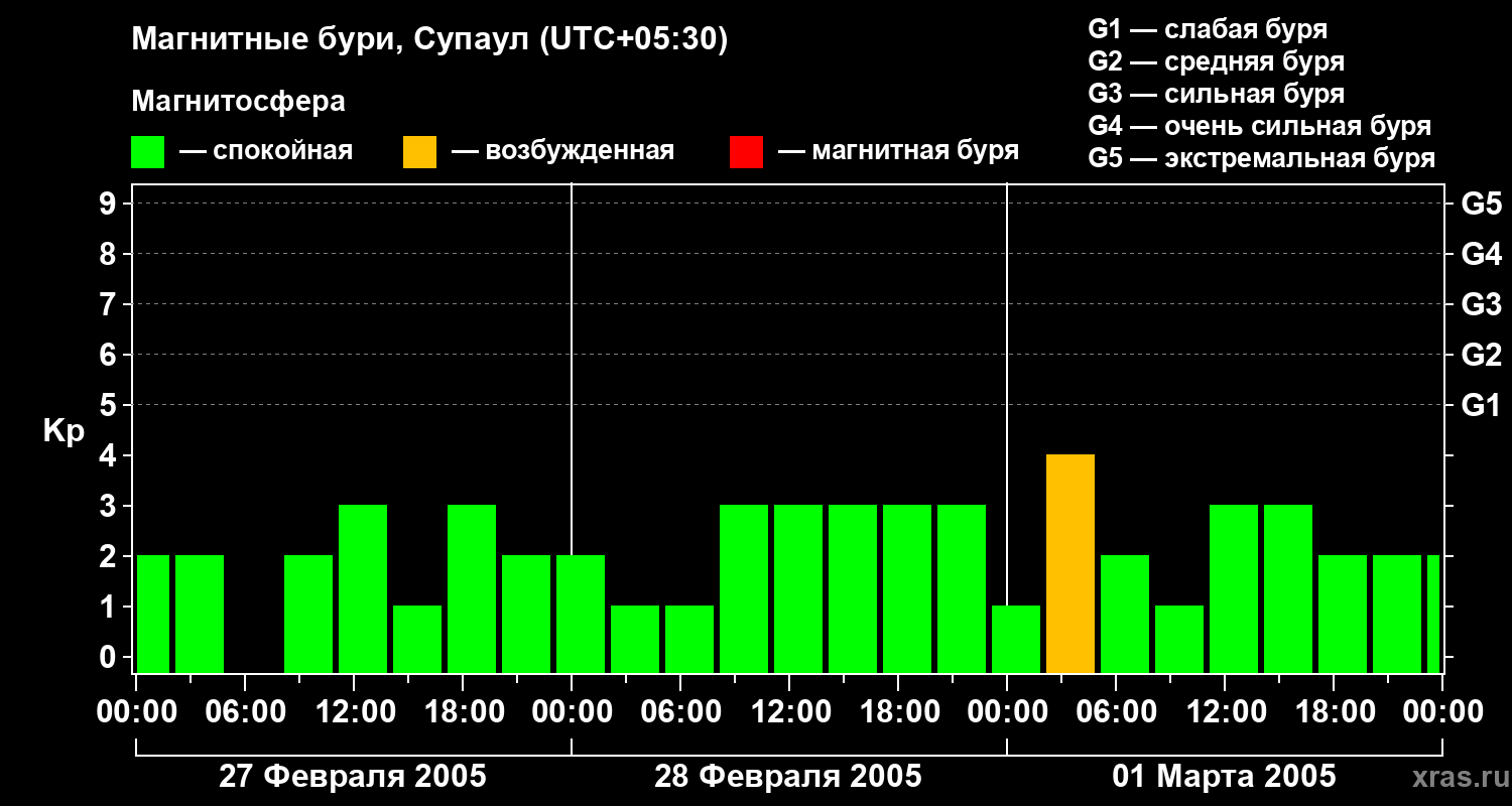 Изменения геомагнитного индекса Kp с 27 февраля по 1 марта 2005 года для средних широт