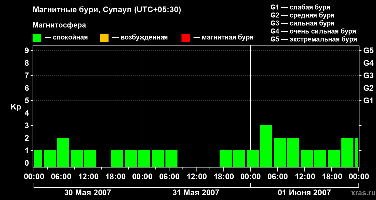 Изменения геомагнитного индекса Kp с 30 мая по 1 июня 2007 года для средних широт