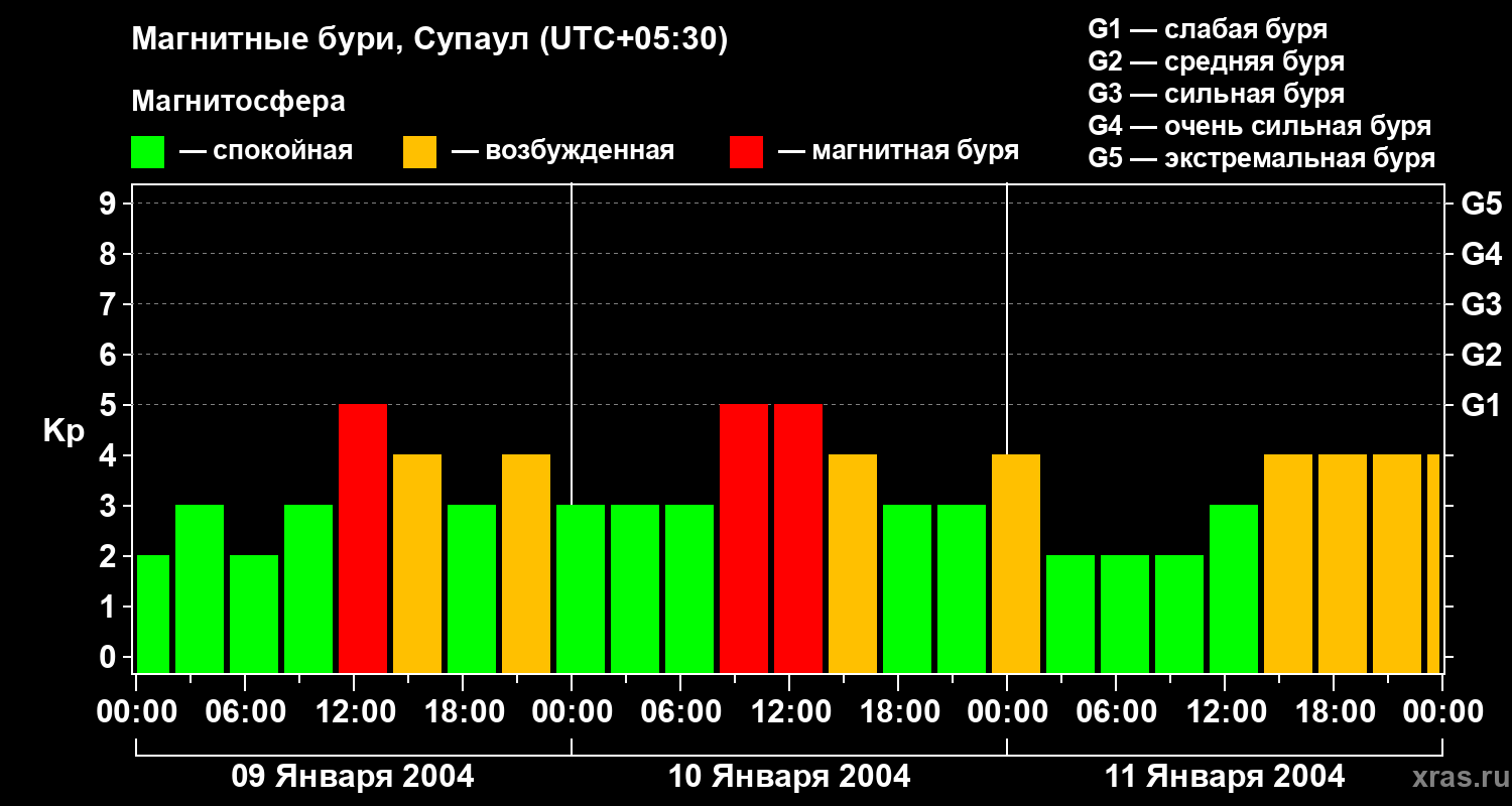 Изменения геомагнитного индекса Kp с 9 по 11 января 2004 года для средних широт