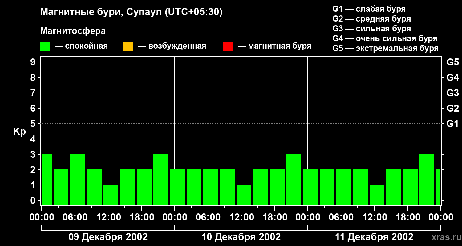 Изменения геомагнитного индекса Kp с 9 по 11 декабря 2002 года для средних широт