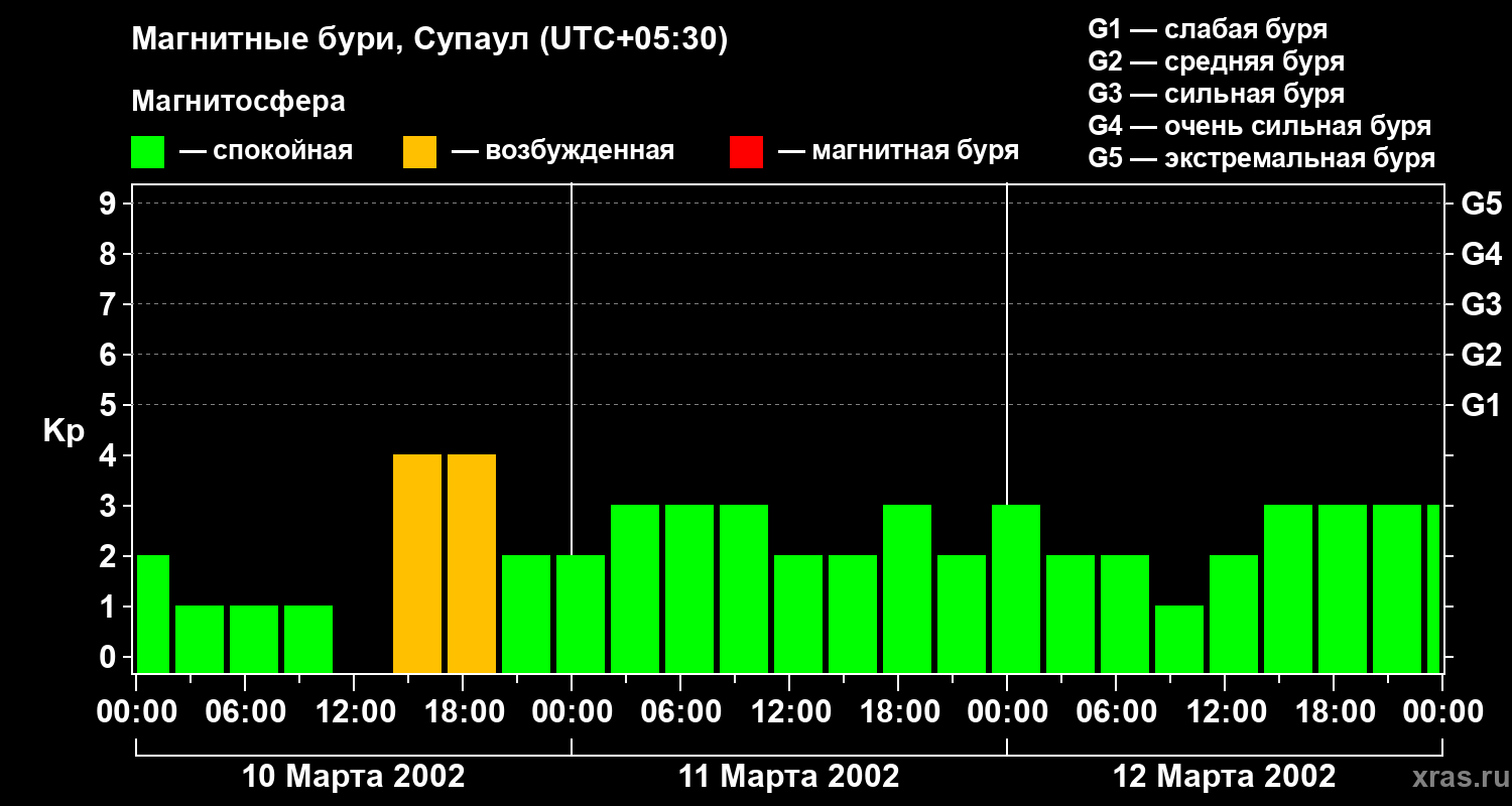 Изменения геомагнитного индекса Kp с 10 по 12 марта 2002 года для средних широт