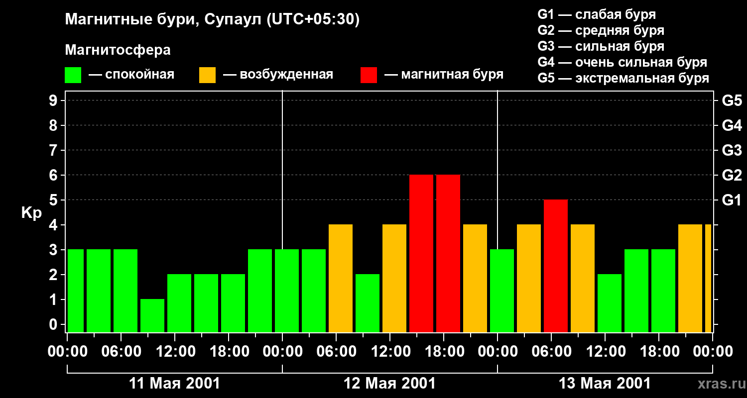 Изменения геомагнитного индекса Kp с 11 по 13 мая 2001 года для средних широт