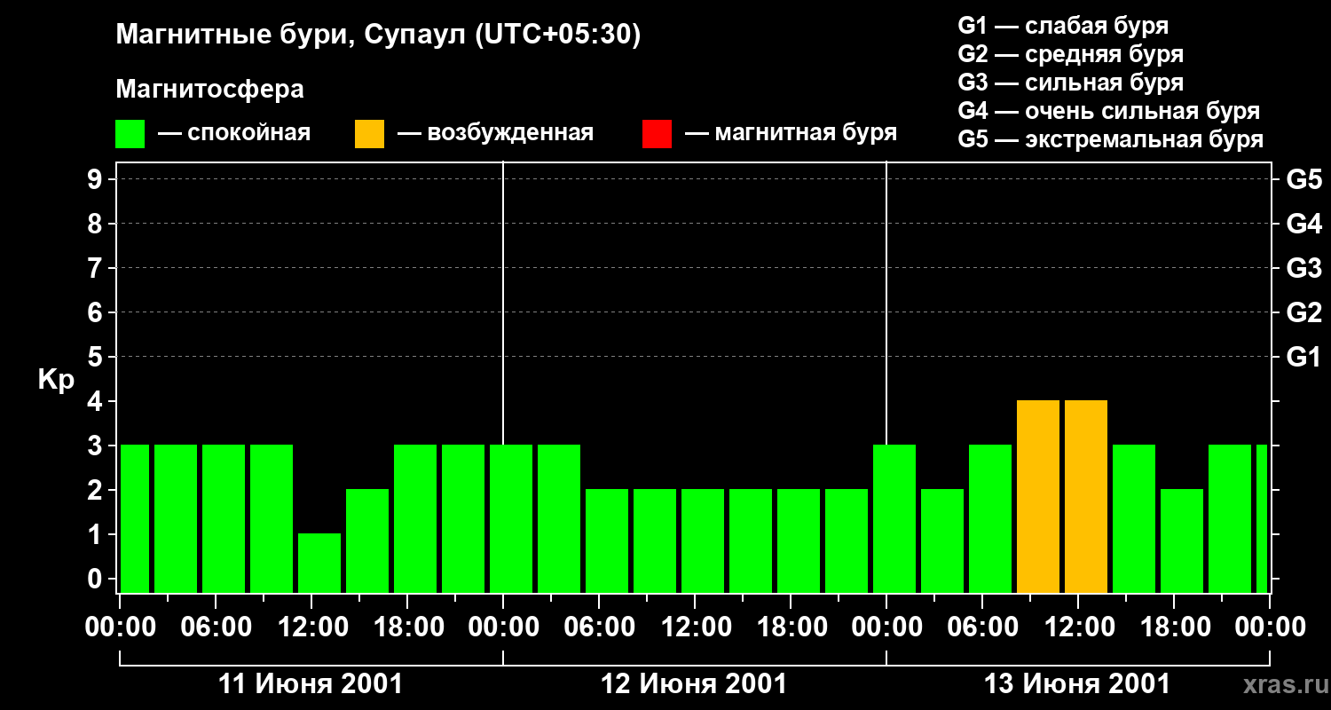 Изменения геомагнитного индекса Kp с 11 по 13 июня 2001 года для средних широт