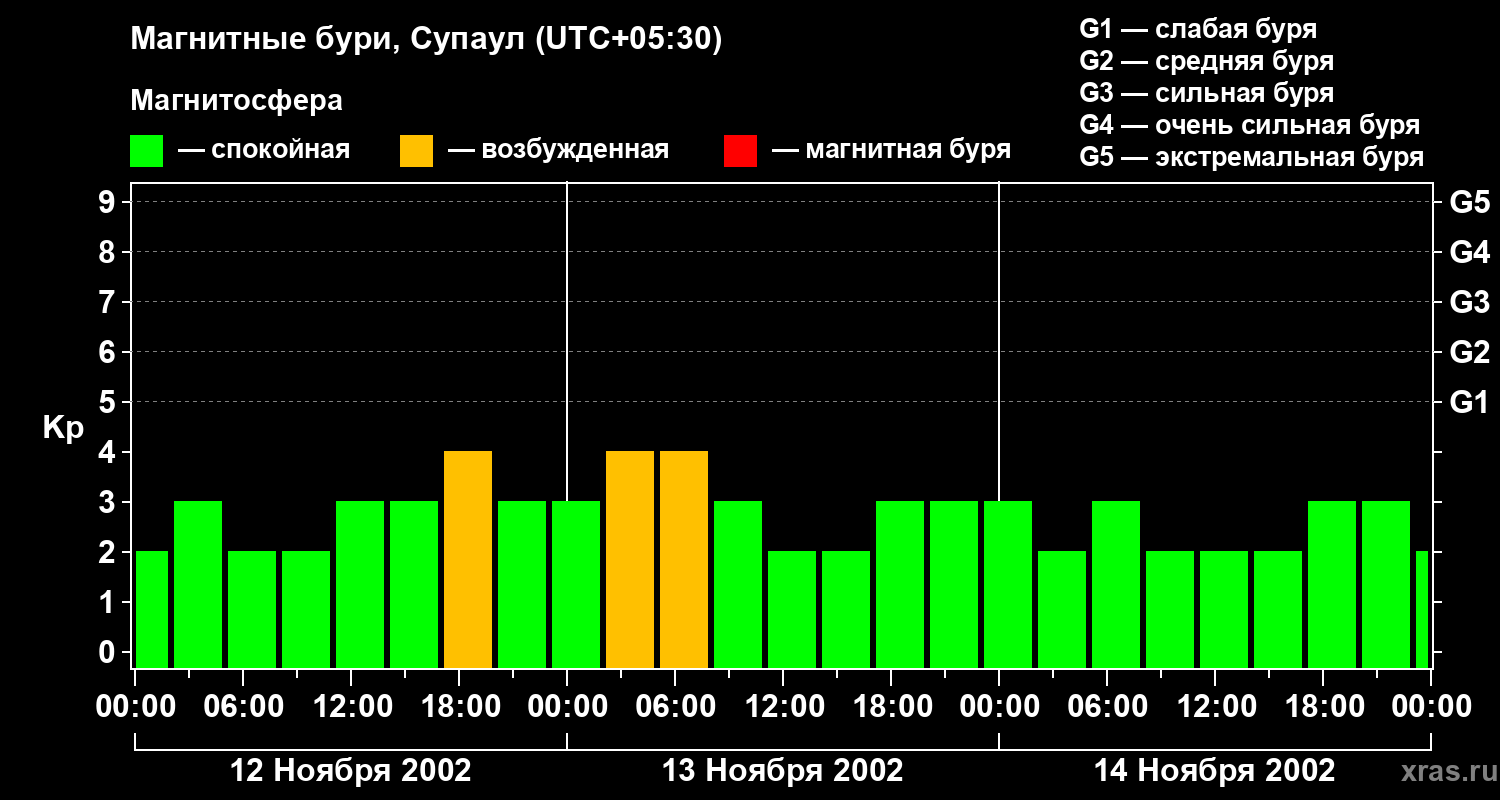 Изменения геомагнитного индекса Kp с 12 по 14 ноября 2002 года для средних широт