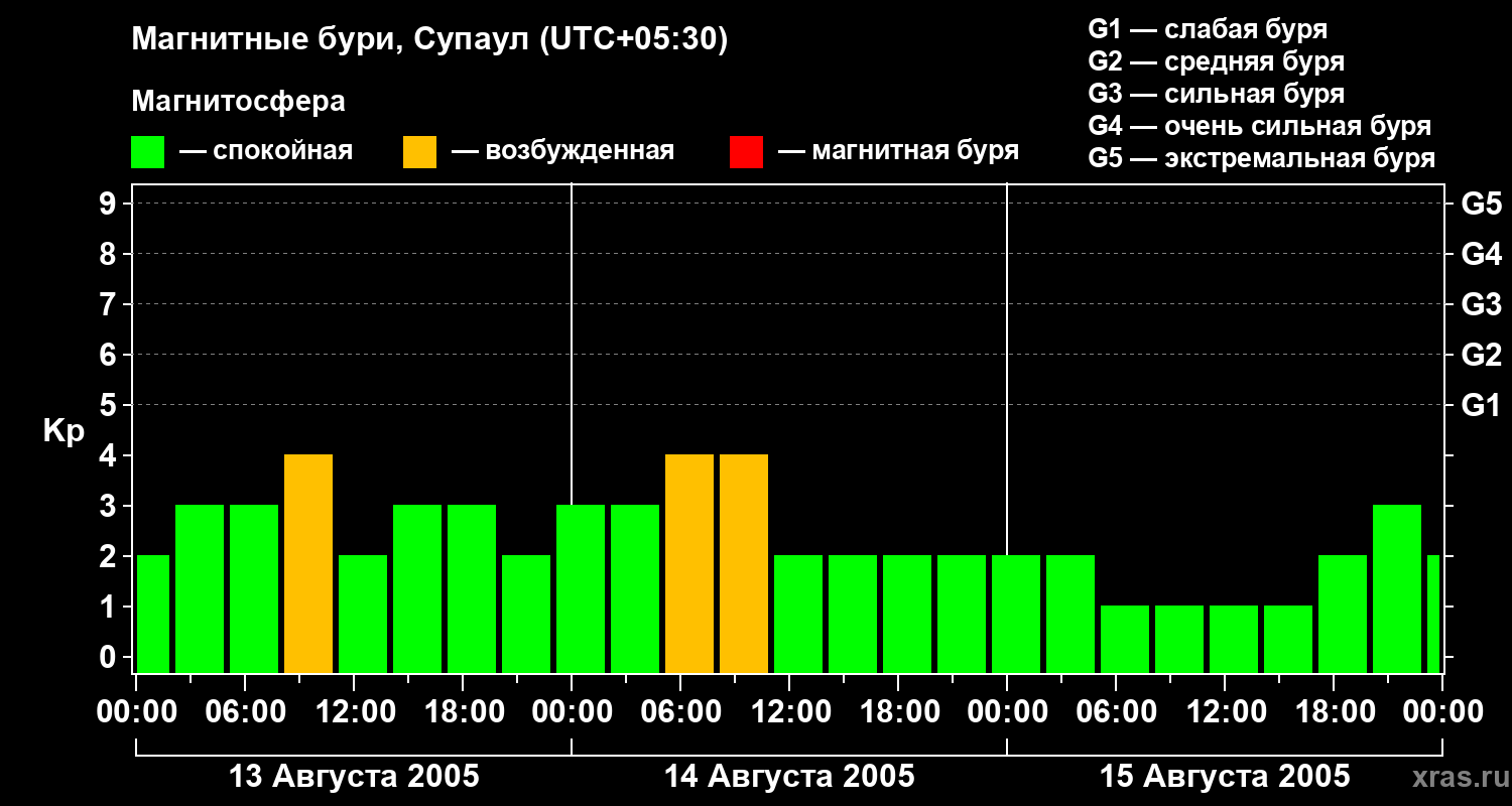Изменения геомагнитного индекса Kp с 13 по 15 августа 2005 года для средних широт