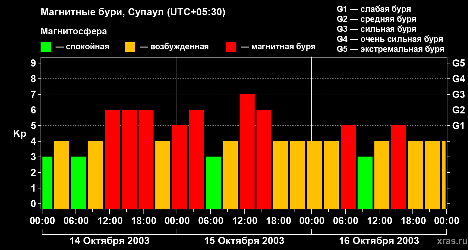 Изменения геомагнитного индекса Kp с 14 по 16 октября 2003 года для средних широт