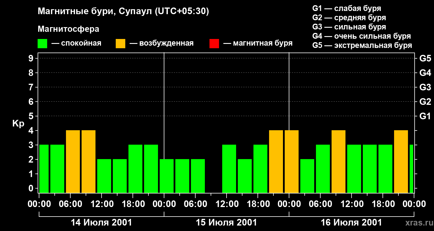 Изменения геомагнитного индекса Kp с 14 по 16 июля 2001 года для средних широт