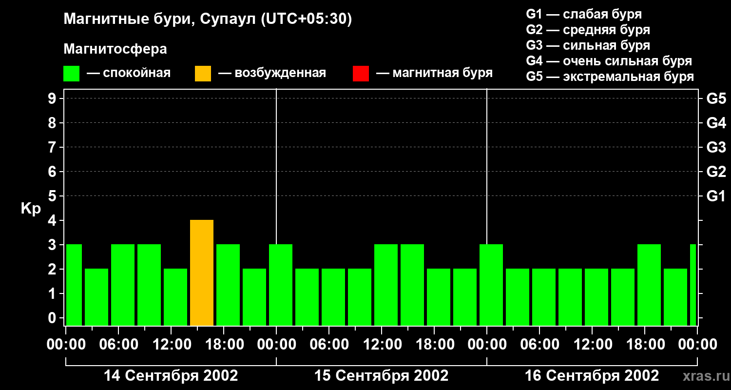 Изменения геомагнитного индекса Kp с 14 по 16 сентября 2002 года для средних широт