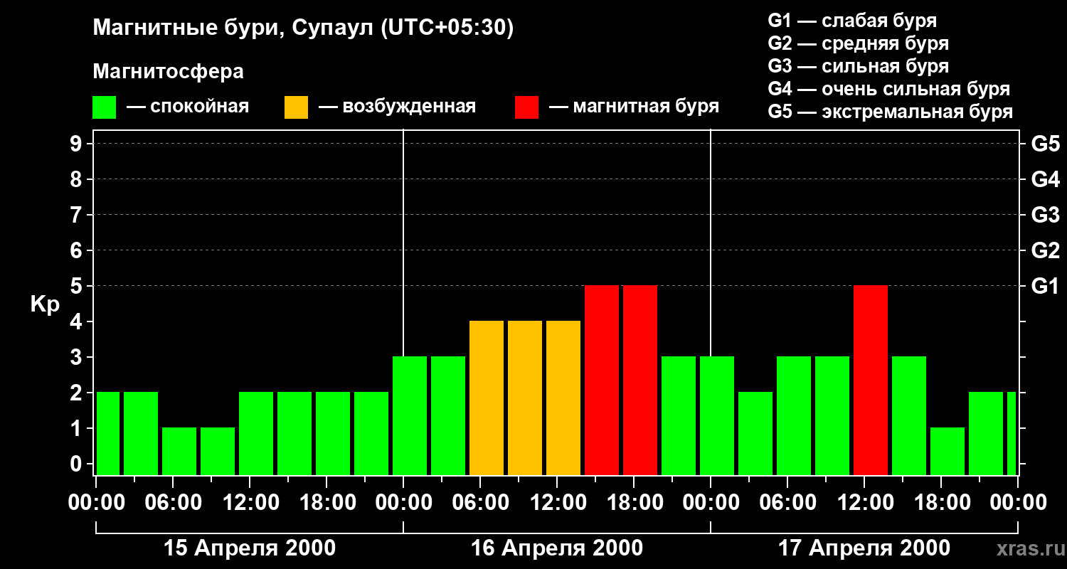 Изменения геомагнитного индекса Kp с 15 по 17 апреля 2000 года для средних широт