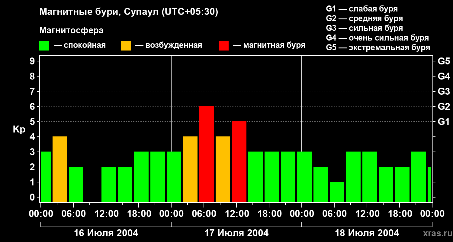 Изменения геомагнитного индекса Kp с 16 по 18 июля 2004 года для средних широт