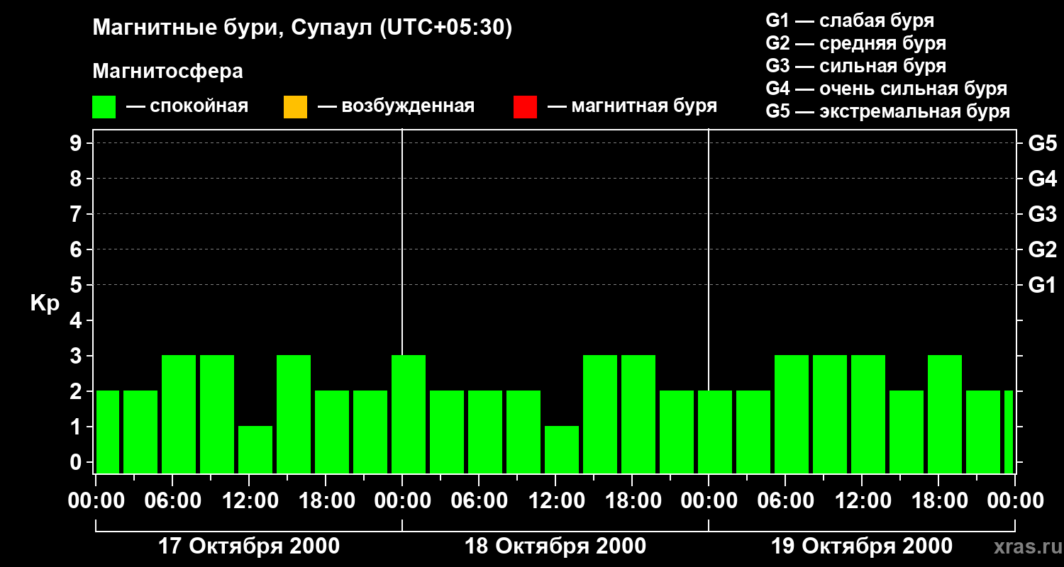 Изменения геомагнитного индекса Kp с 17 по 19 октября 2000 года для средних широт