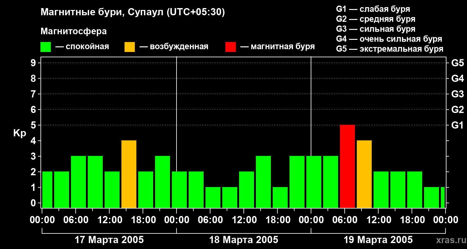Изменения геомагнитного индекса Kp с 17 по 19 марта 2005 года для средних широт
