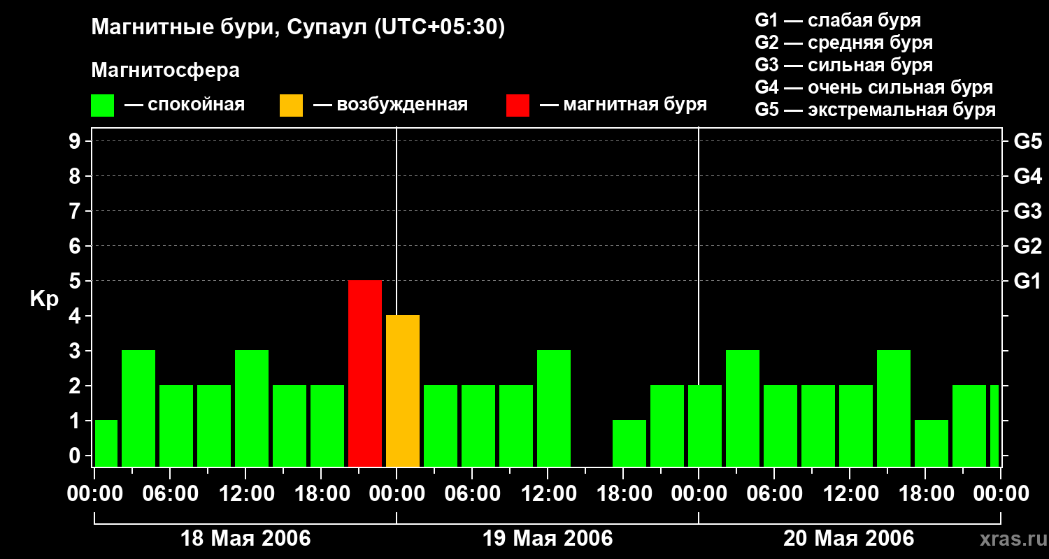 Изменения геомагнитного индекса Kp с 18 по 20 мая 2006 года для средних широт
