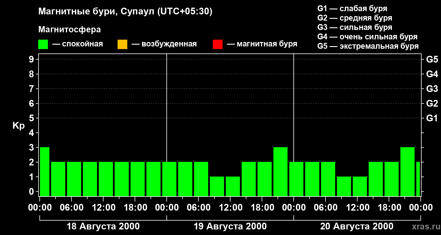 Изменения геомагнитного индекса Kp с 18 по 20 августа 2000 года для средних широт