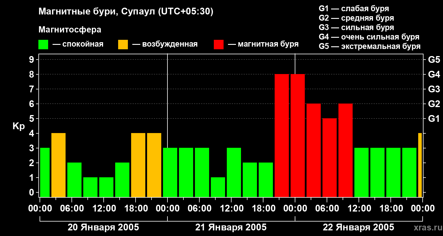Изменения геомагнитного индекса Kp с 20 по 22 января 2005 года для средних широт