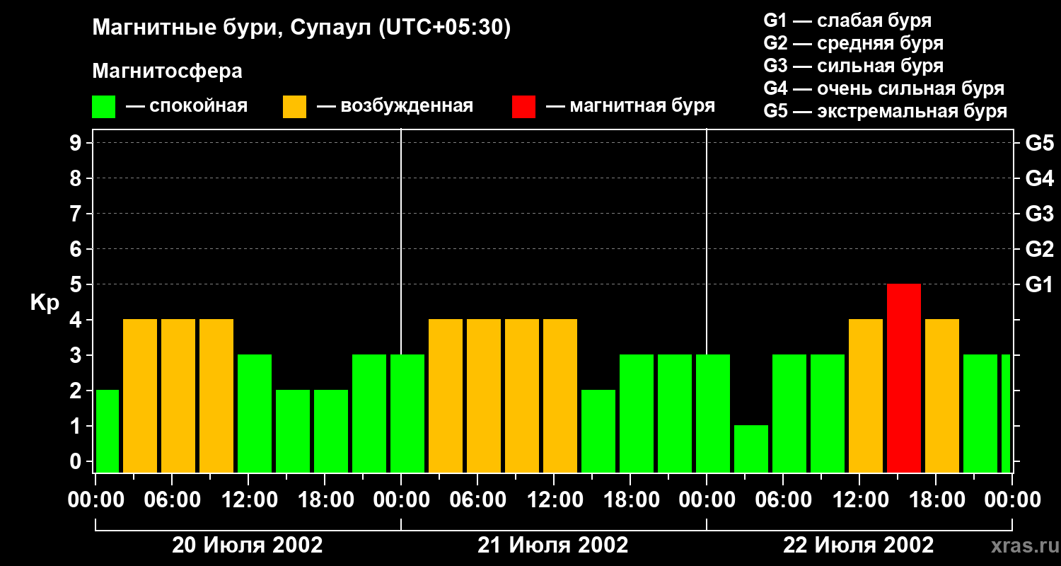 Изменения геомагнитного индекса Kp с 20 по 22 июля 2002 года для средних широт
