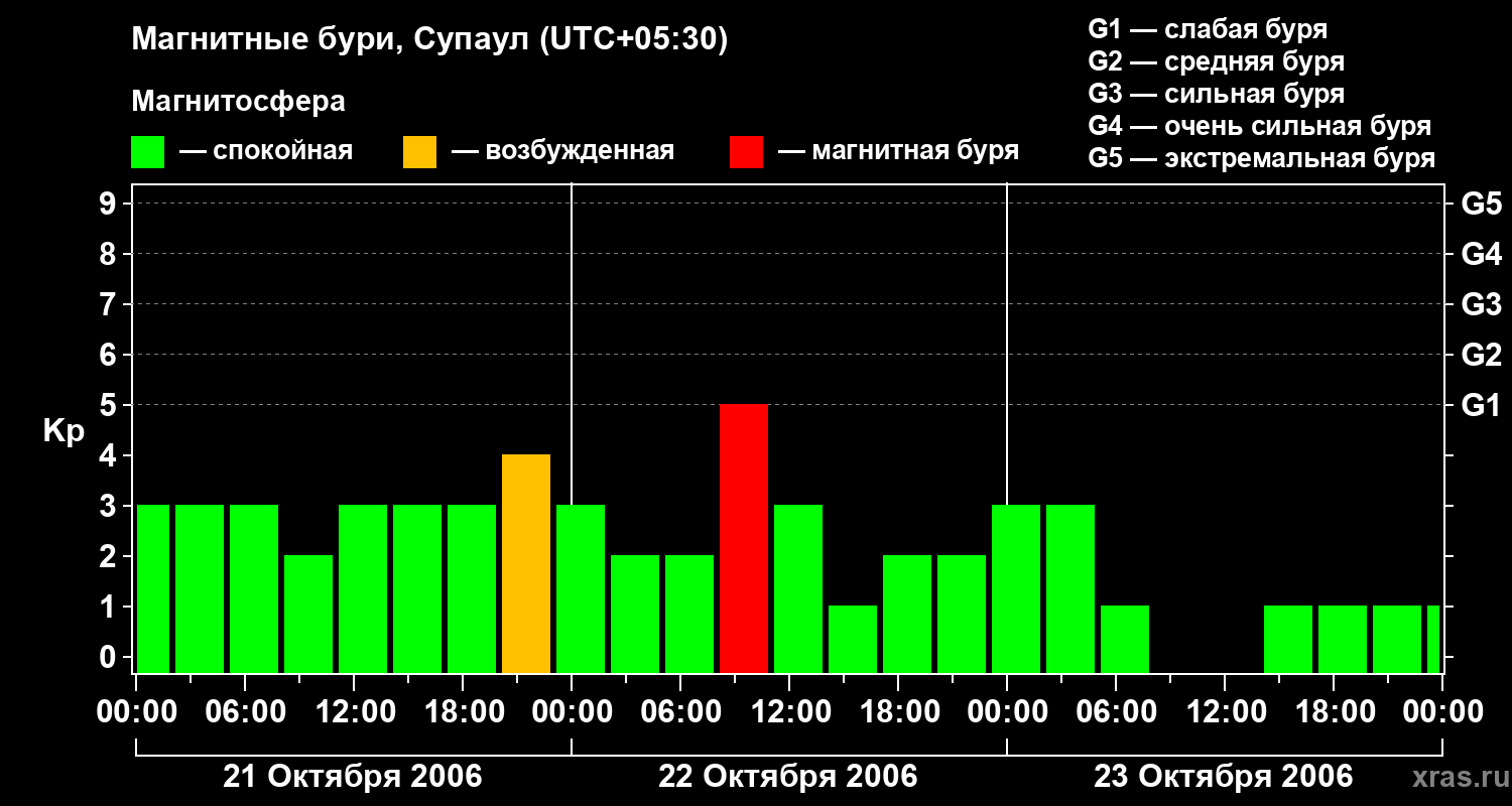Изменения геомагнитного индекса Kp с 21 по 23 октября 2006 года для средних широт