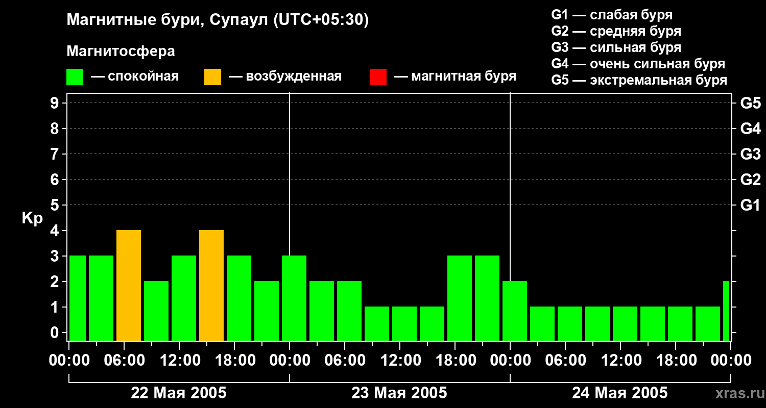 Изменения геомагнитного индекса Kp с 22 по 24 мая 2005 года для средних широт