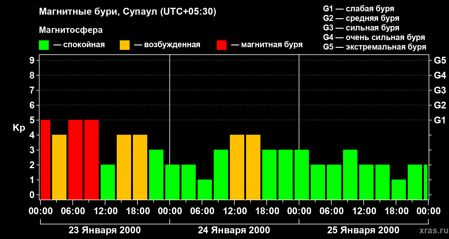 Изменения геомагнитного индекса Kp с 23 по 25 января 2000 года для средних широт