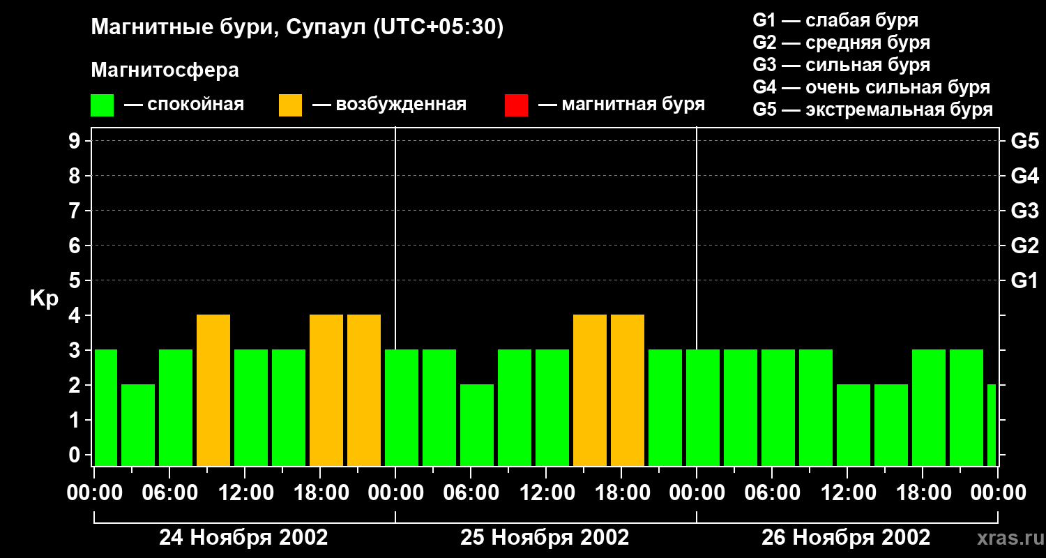 Изменения геомагнитного индекса Kp с 24 по 26 ноября 2002 года для средних широт