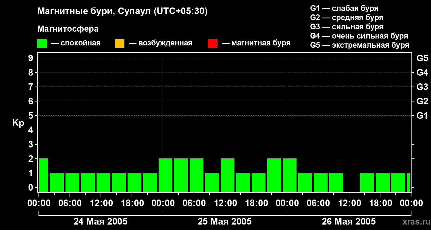 Изменения геомагнитного индекса Kp с 24 по 26 мая 2005 года для средних широт