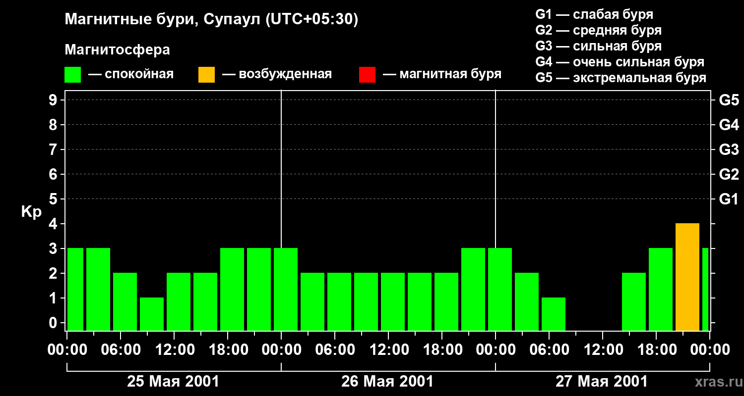 Изменения геомагнитного индекса Kp с 25 по 27 мая 2001 года для средних широт