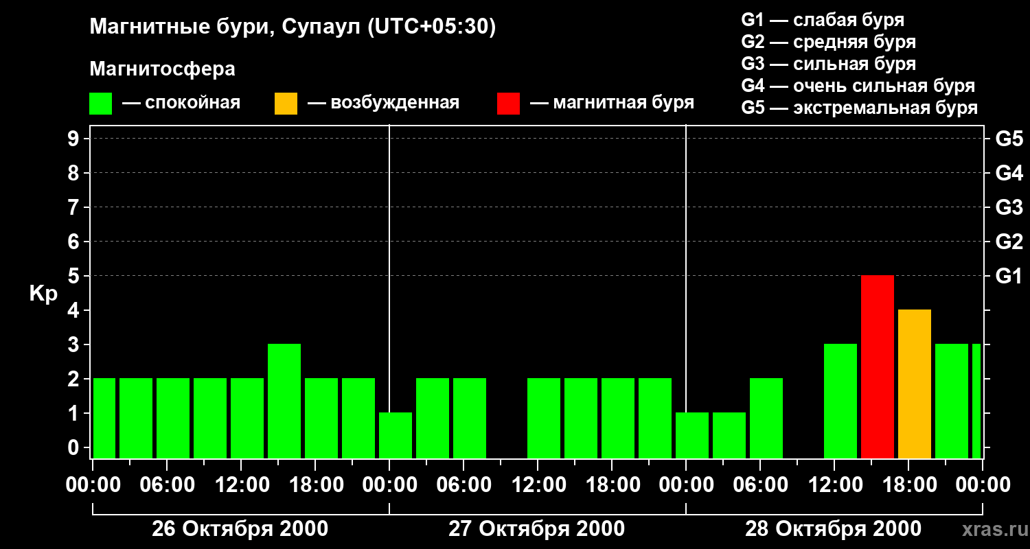 Изменения геомагнитного индекса Kp с 26 по 28 октября 2000 года для средних широт