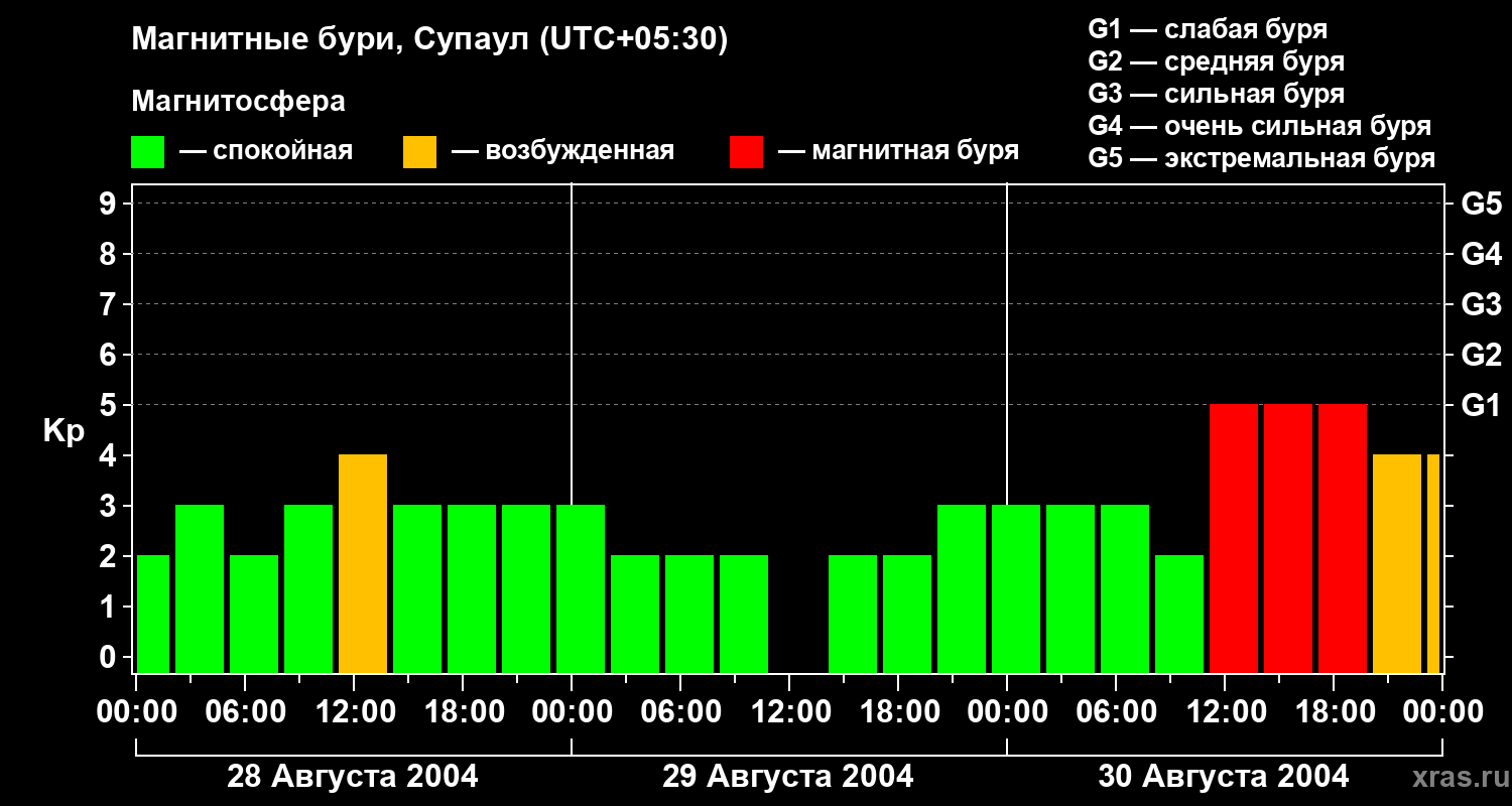 Изменения геомагнитного индекса Kp с 28 по 30 августа 2004 года для средних широт
