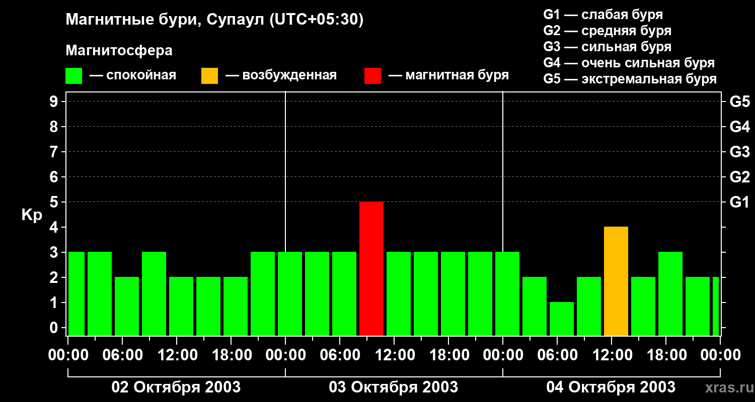 Изменения геомагнитного индекса Kp с 2 по 4 октября 2003 года для средних широт
