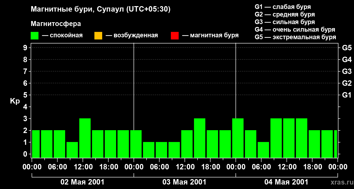Изменения геомагнитного индекса Kp с 2 по 4 мая 2001 года для средних широт
