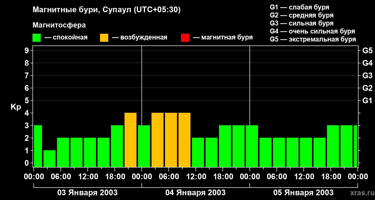 Изменения геомагнитного индекса Kp с 3 по 5 января 2003 года для средних широт