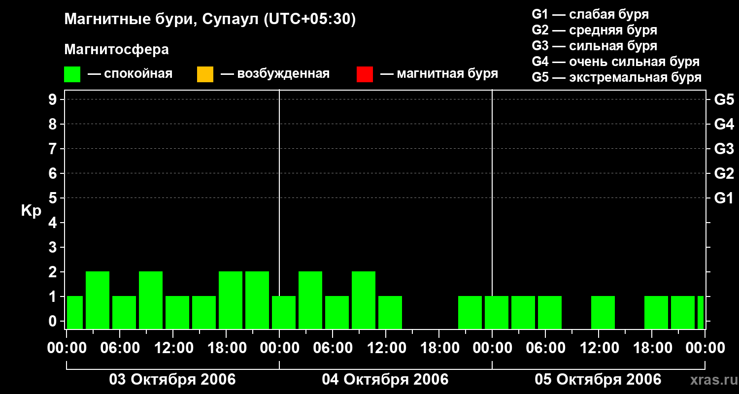 Изменения геомагнитного индекса Kp с 3 по 5 октября 2006 года для средних широт