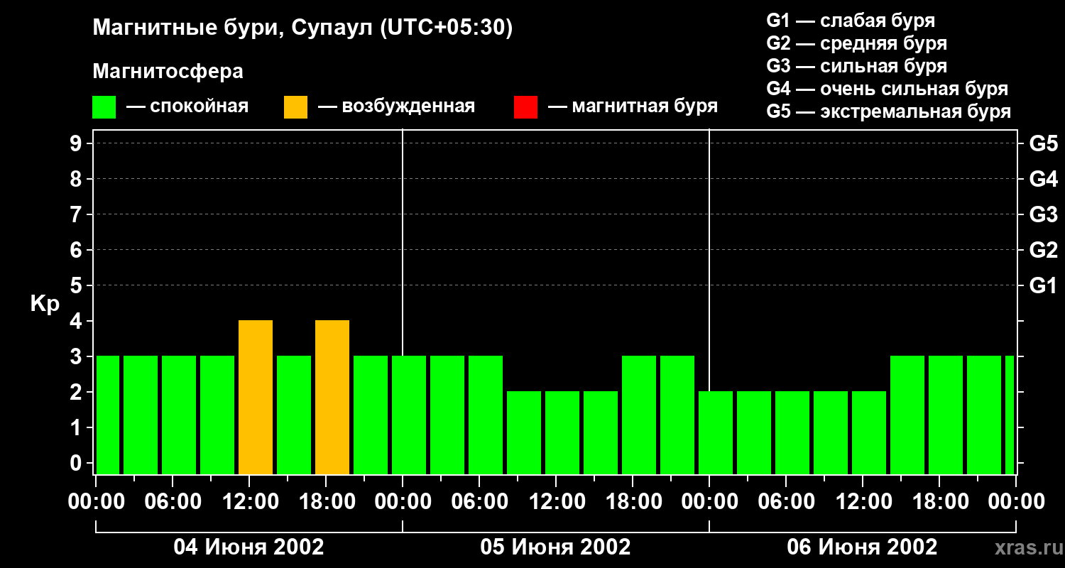 Изменения геомагнитного индекса Kp с 4 по 6 июня 2002 года для средних широт
