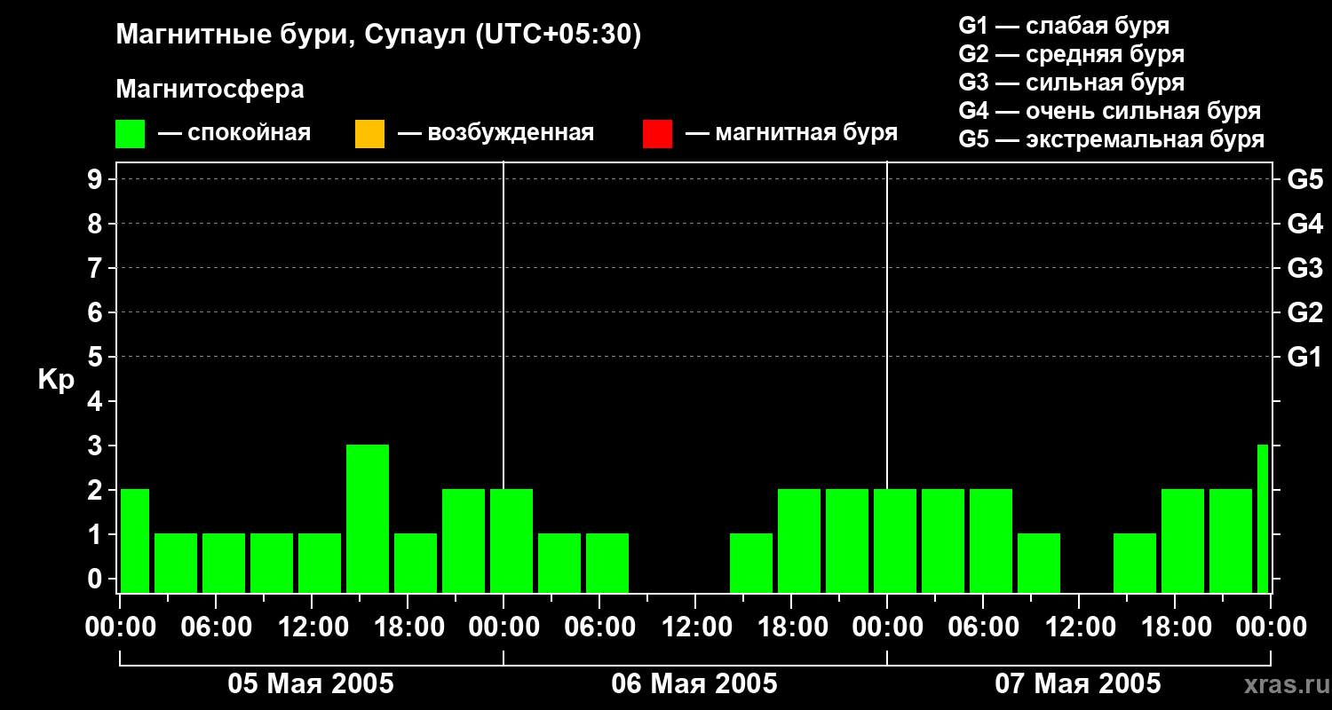 Изменения геомагнитного индекса Kp с 5 по 7 мая 2005 года для средних широт
