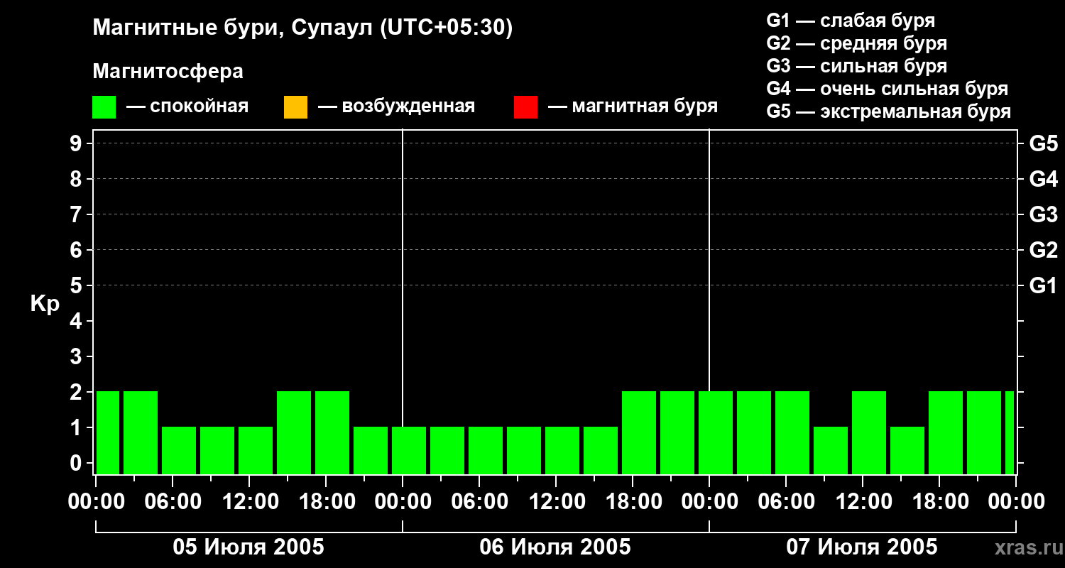 Изменения геомагнитного индекса Kp с 5 по 7 июля 2005 года для средних широт