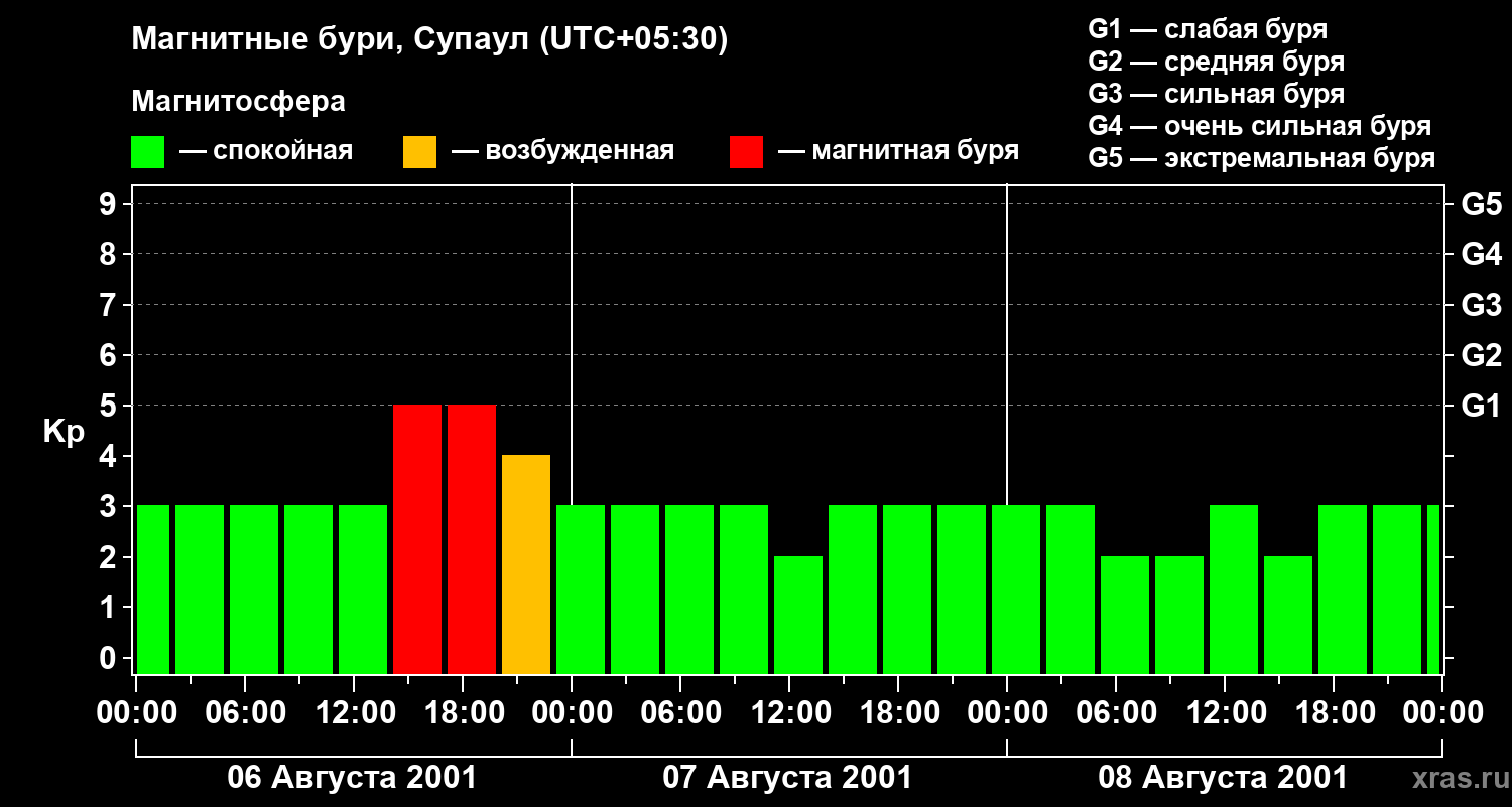 Изменения геомагнитного индекса Kp с 6 по 8 августа 2001 года для средних широт