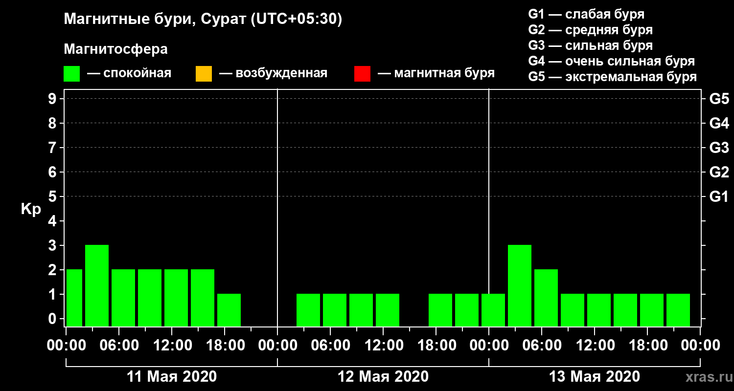 Изменения геомагнитного индекса Kp с 11 по 13 мая 2020 года для средних широт