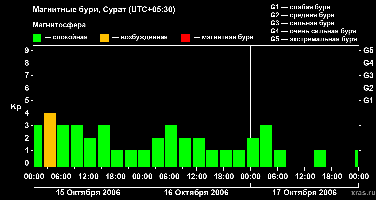 Изменения геомагнитного индекса Kp с 15 по 17 октября 2006 года для средних широт