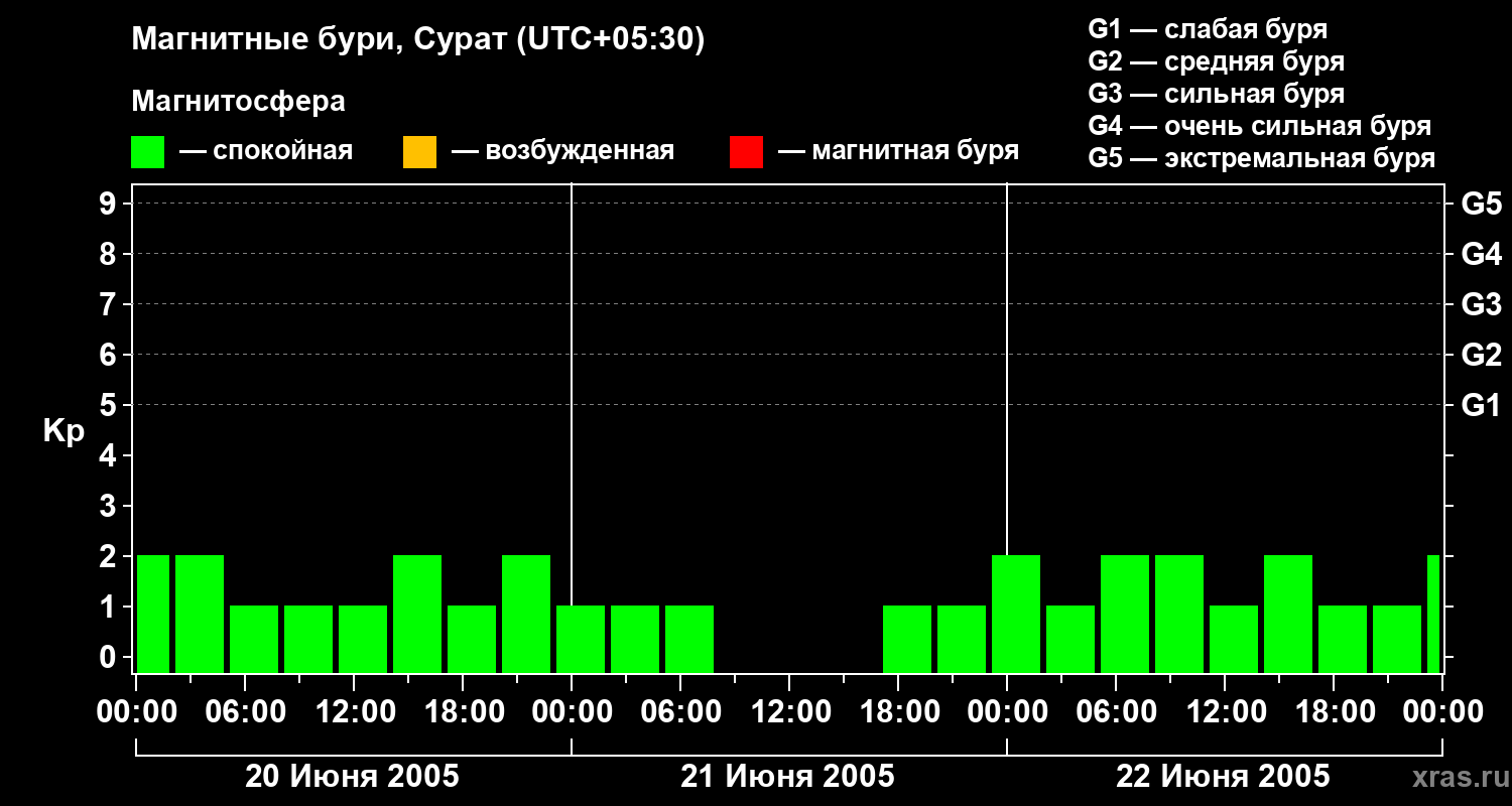 Изменения геомагнитного индекса Kp с 20 по 22 июня 2005 года для средних широт