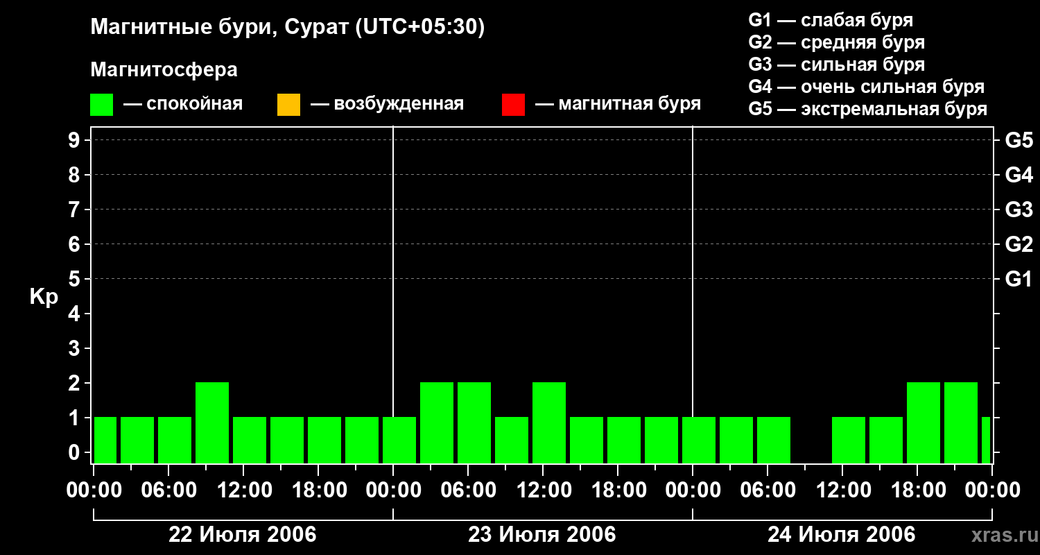 Изменения геомагнитного индекса Kp с 22 по 24 июля 2006 года для средних широт