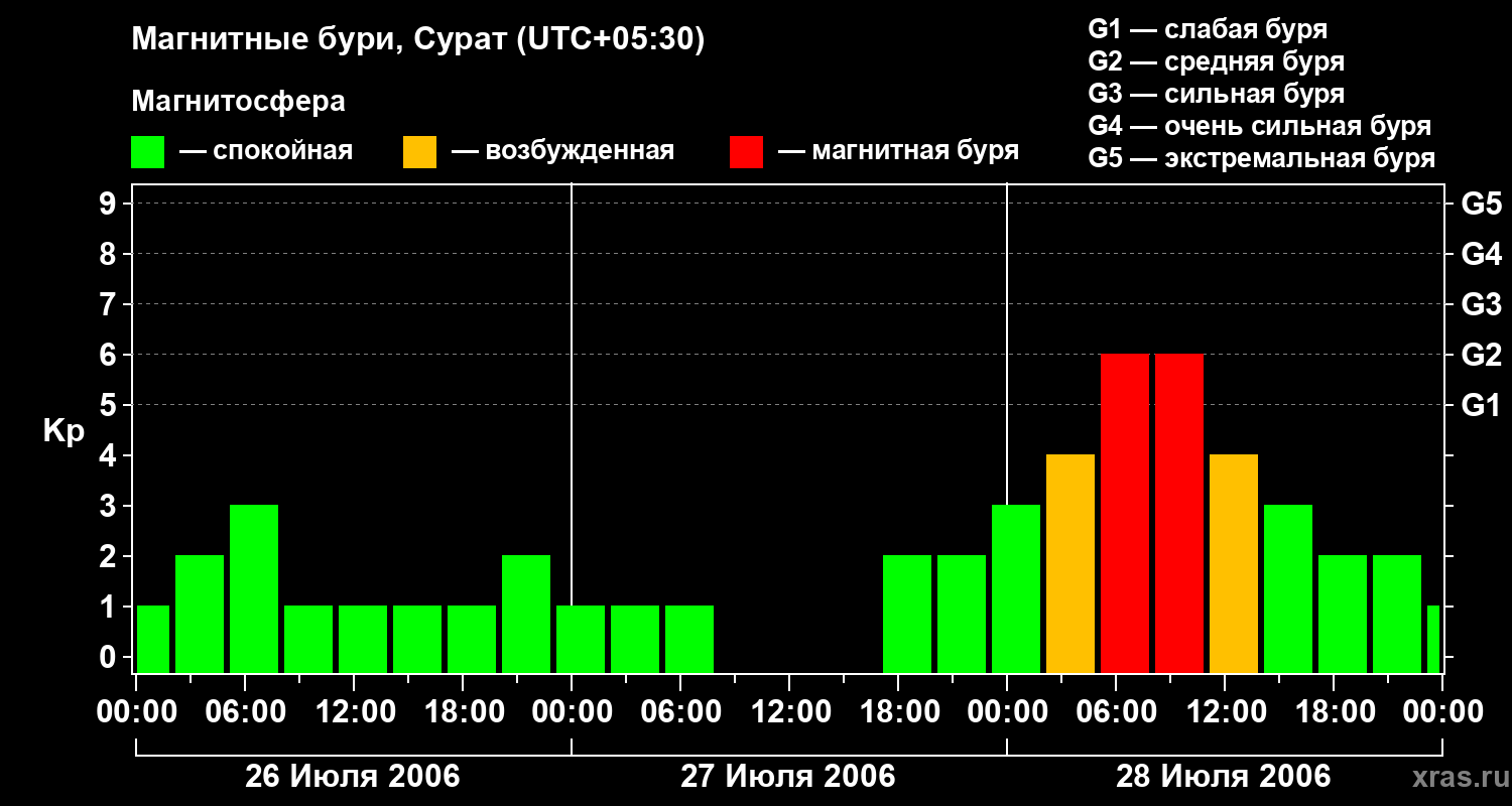 Изменения геомагнитного индекса Kp с 26 по 28 июля 2006 года для средних широт