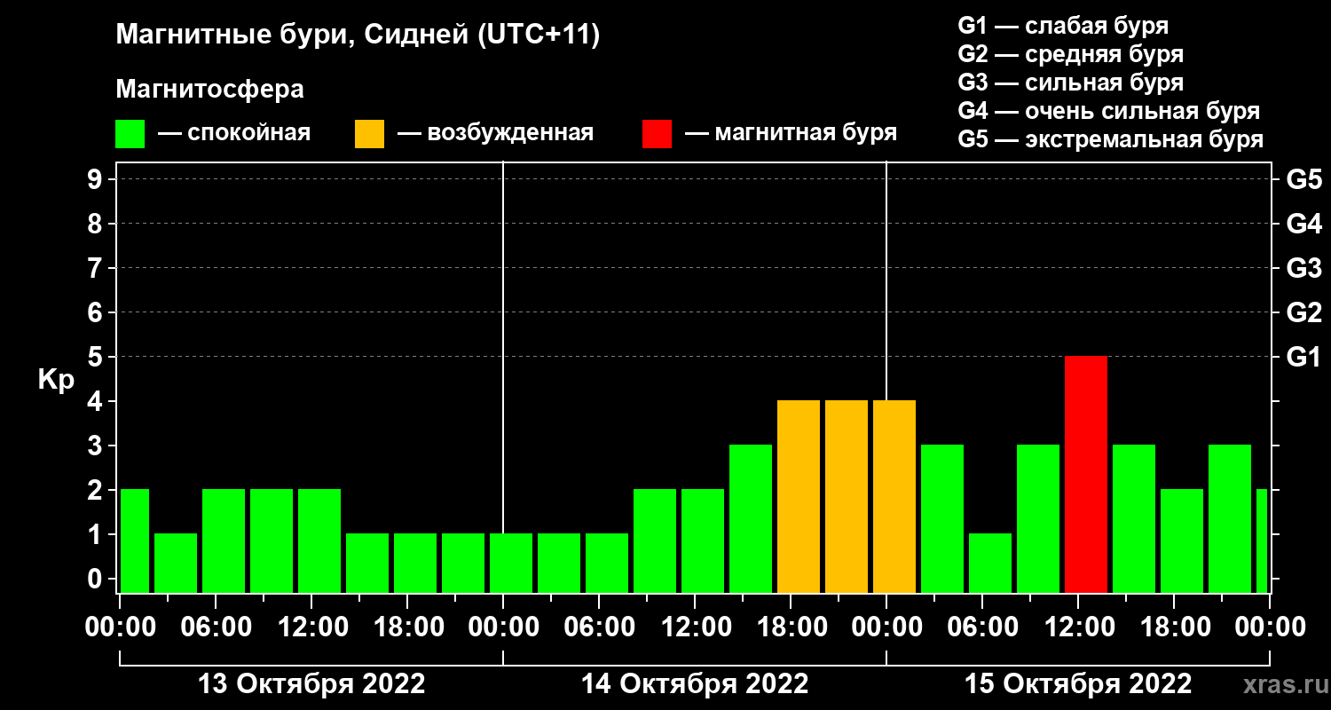 Изменения геомагнитного индекса Kp с 13 по 15 октября 2022 года для средних широт